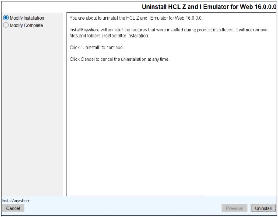 - The Uninstall HCL Z and I Emulator for Web 16.0.0 screen appears.