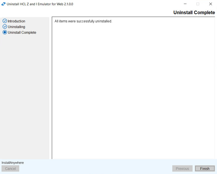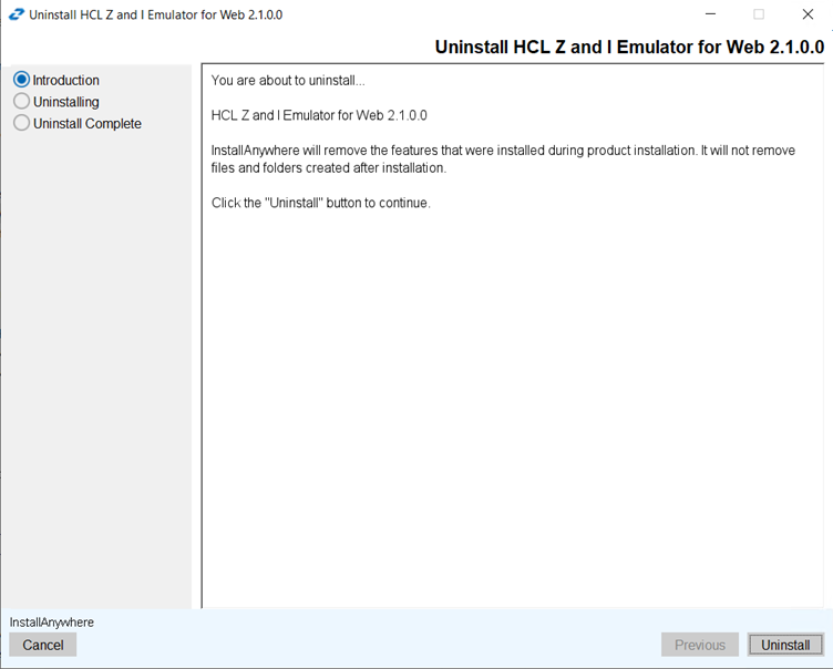 - The Uninstall HCL Z and I Emulator for Web screen displays