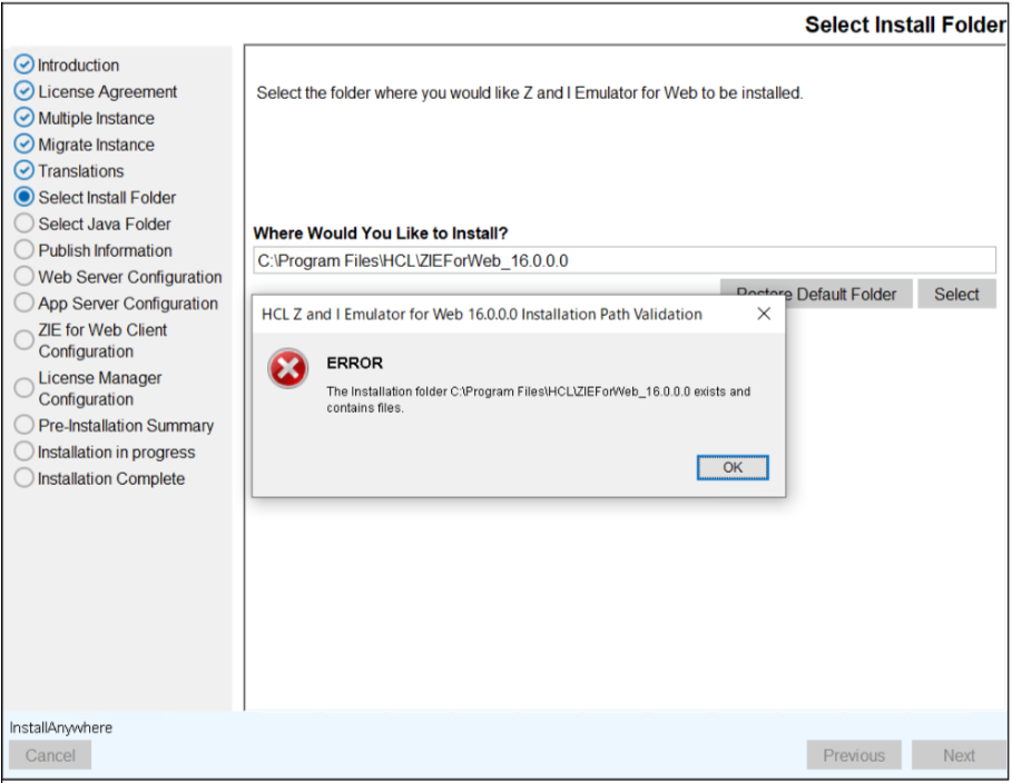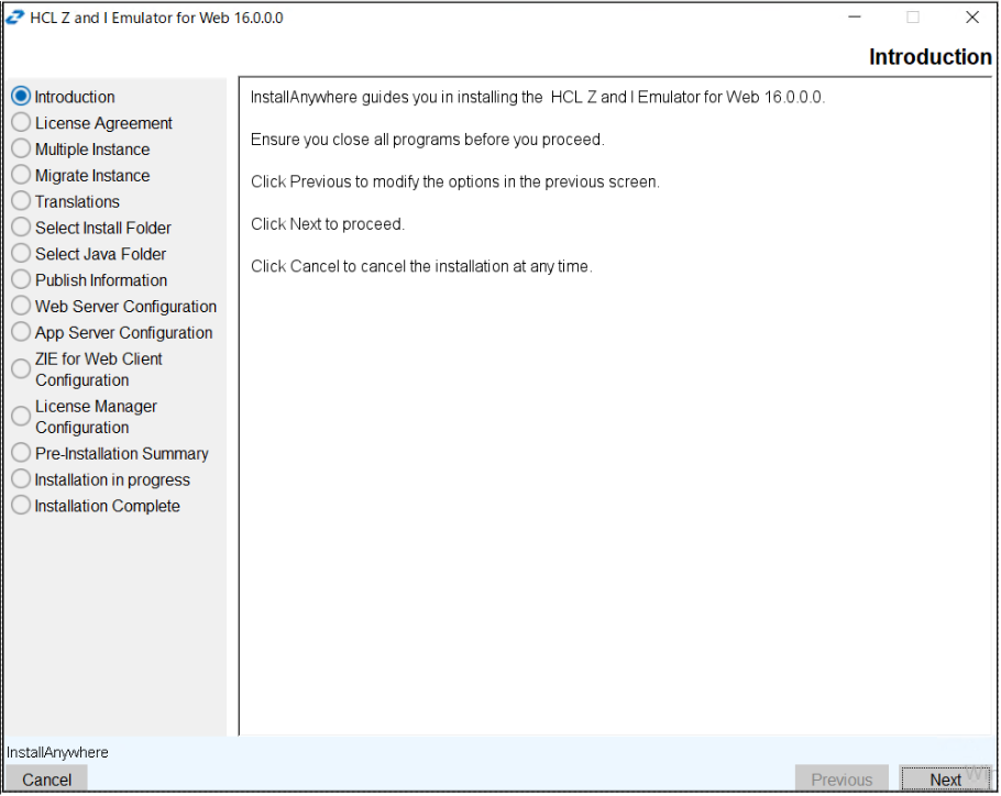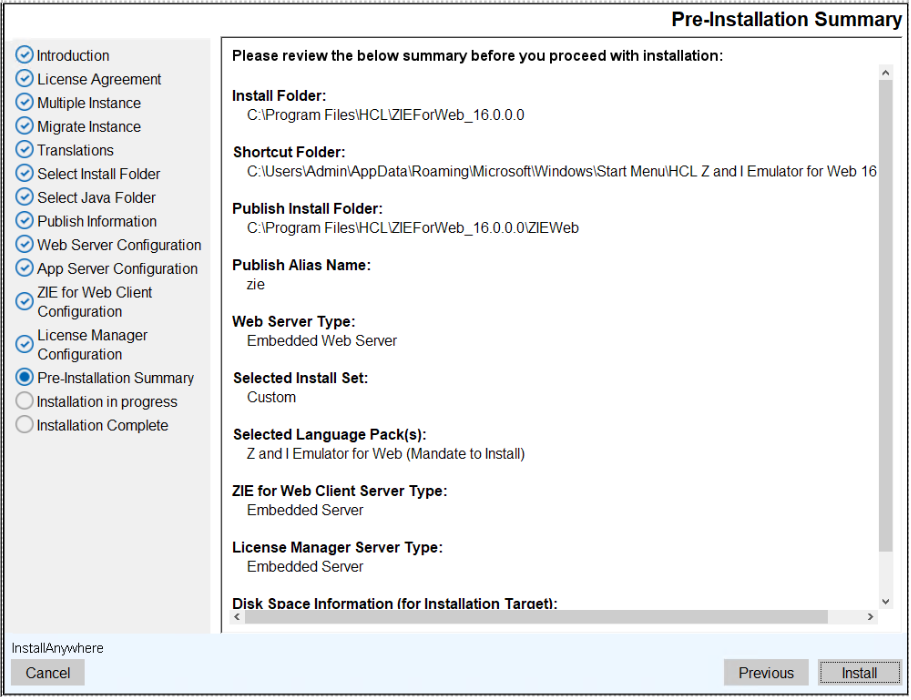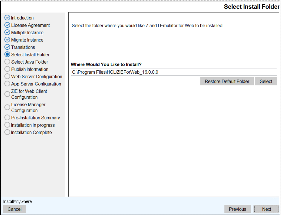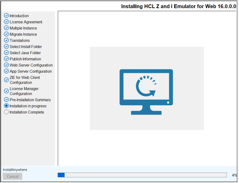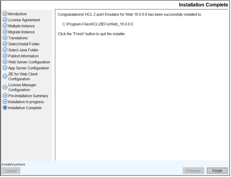 - The Installing HCL Z and I Emulator for Web 16.0.0 screen appears, which displays