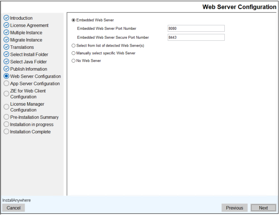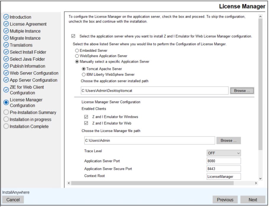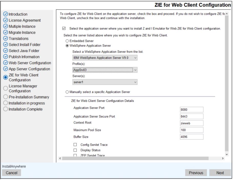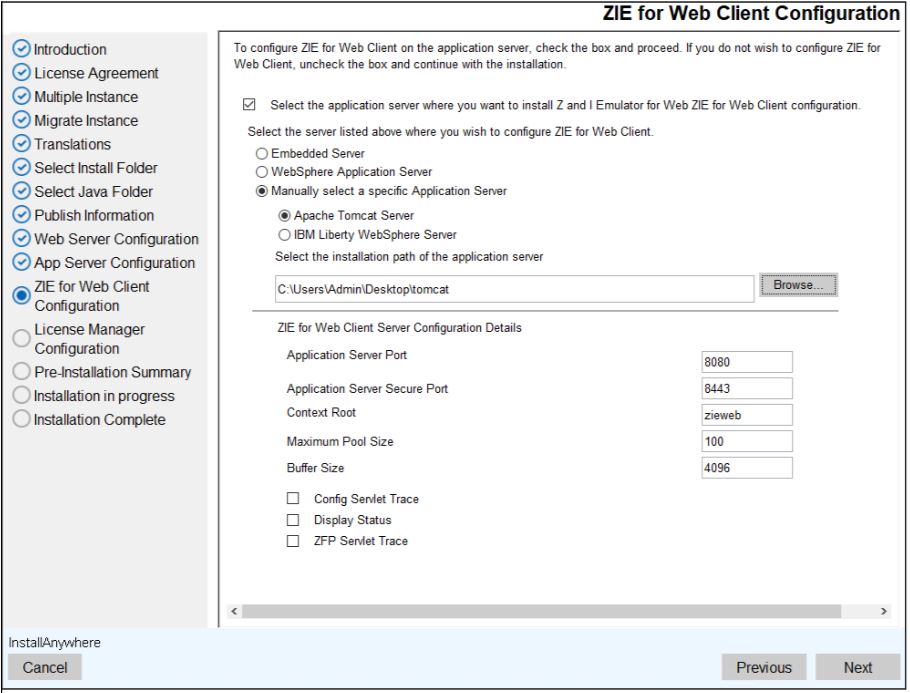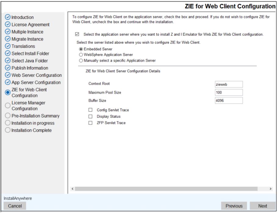 - If no web server is selected, the Z and I Emulator for Web Client and License Manager will not be configured.