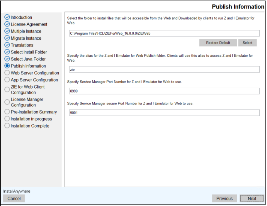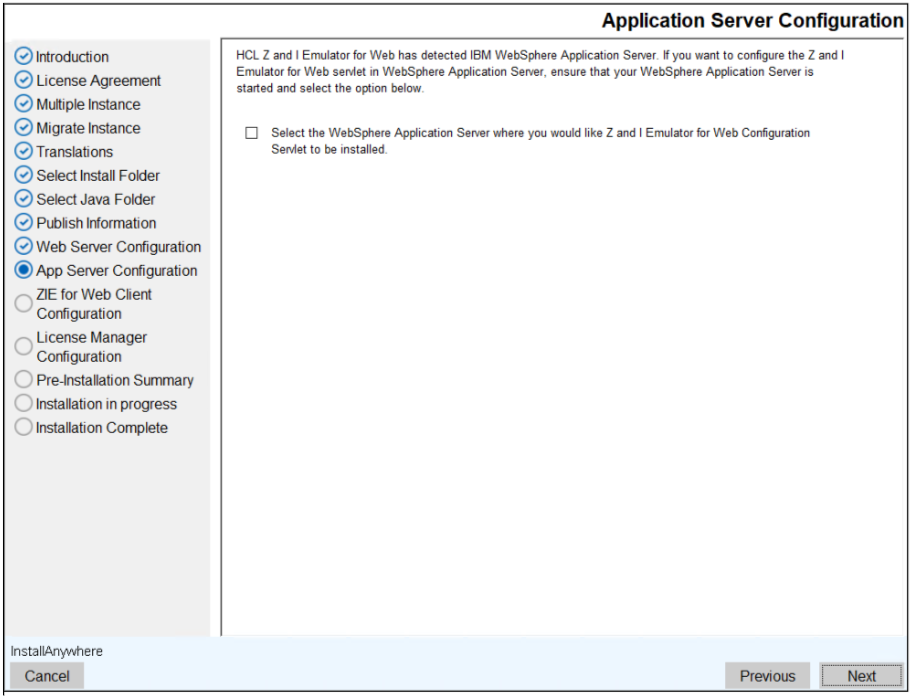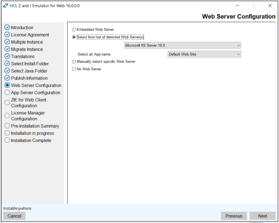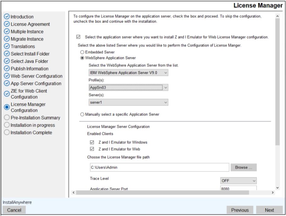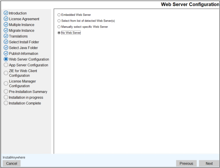 - If no web server is selected, the Z and I Emulator for Web Client and License Manager will not be configured.