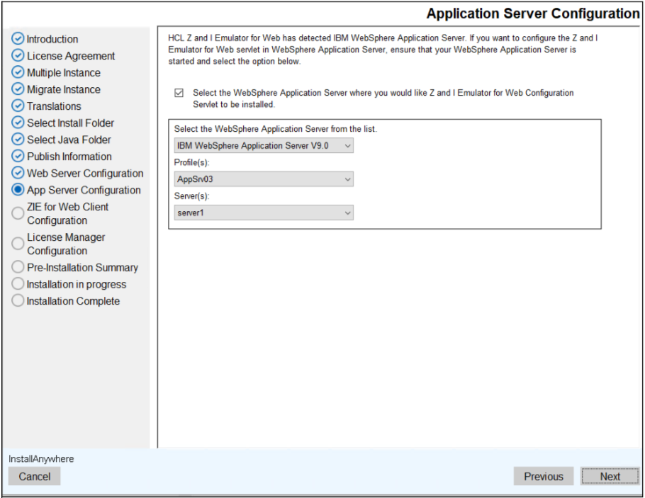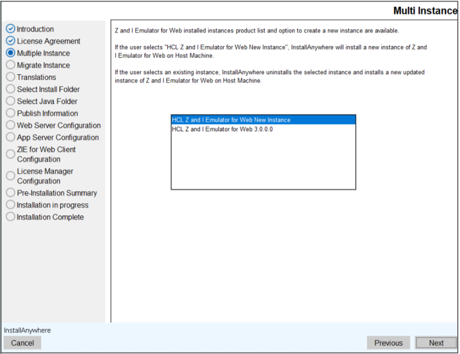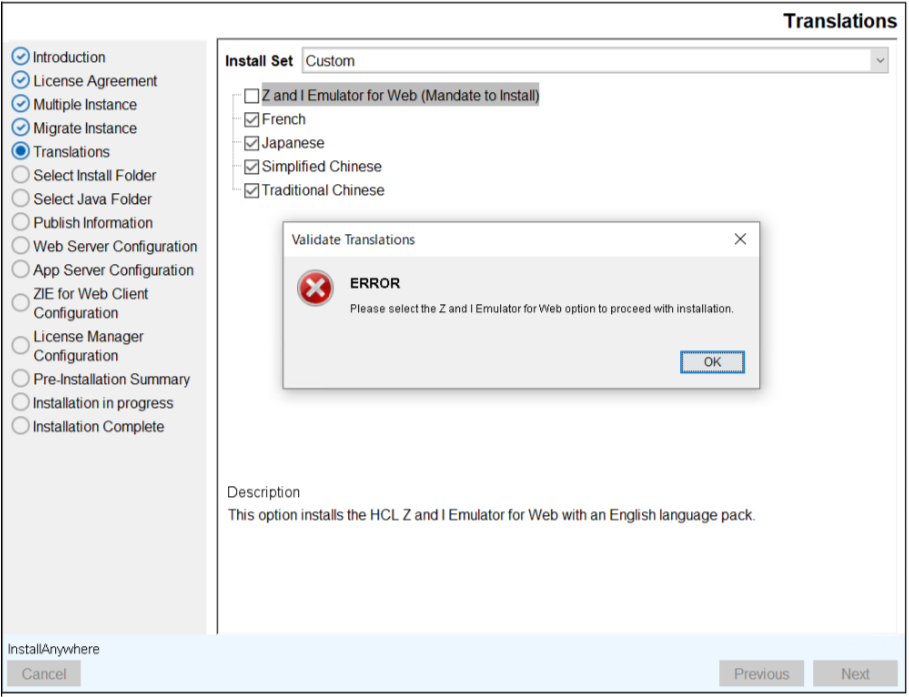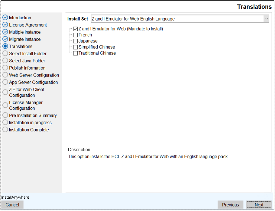 Note: The Multiple Instance panel is displayed when an earlier version of InstallAnywhere Z and I Emulator for Web is installed. - The Translations screen appears.