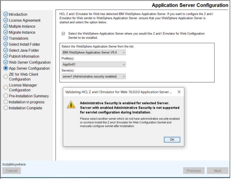 Note: The HCL Z and I Emulator for Web does not support an Administrative Security webserver. The validating message window appears as shown below.