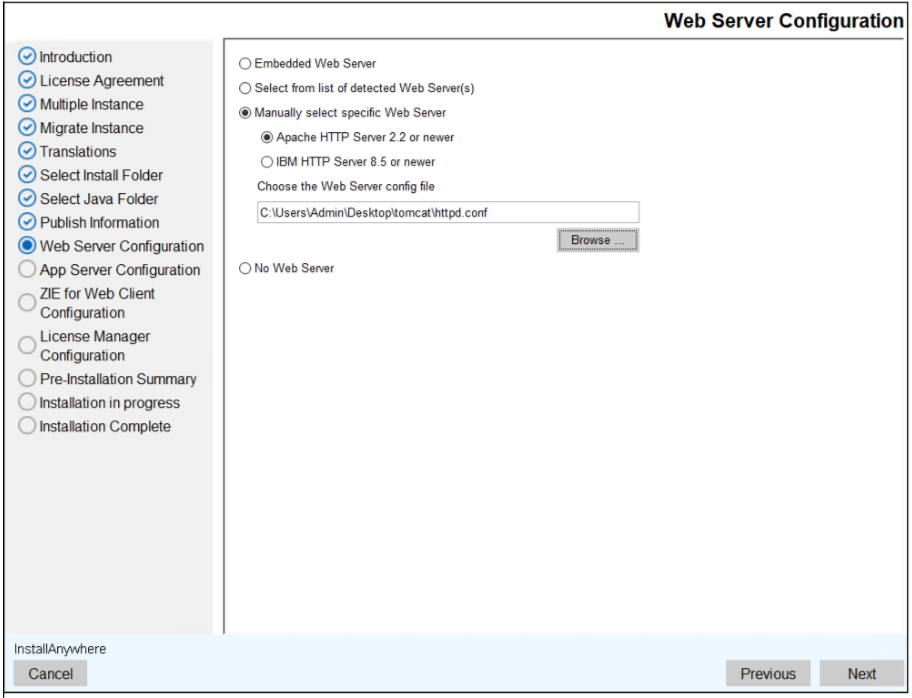Note: From Apache 2.4, ZIEWEB will no longer automatically detect the installed Apache web server instance. To proceed, manually select the Apache web server option during the ZIEWEB installation process. - Manually select Specific web server: Manually select the required web server.