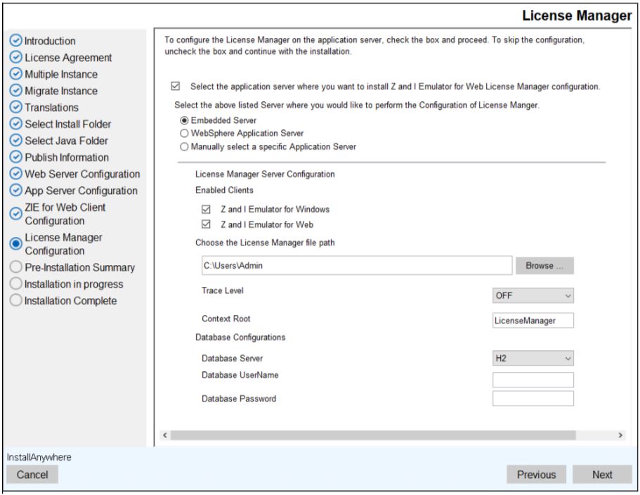 - If the Embedded Web Server option is not selected in the Web Server Panel, the Embedded Server will not appear on the License Manager panel.