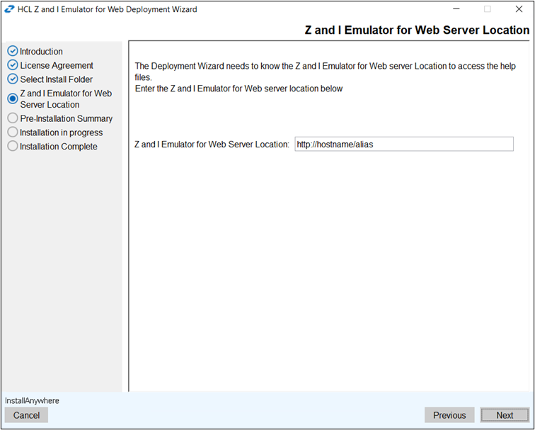 Note: During upgrade, a user will not able to change the installation path. - The Z and I Emulator for Web Server Location screen appears. Enter