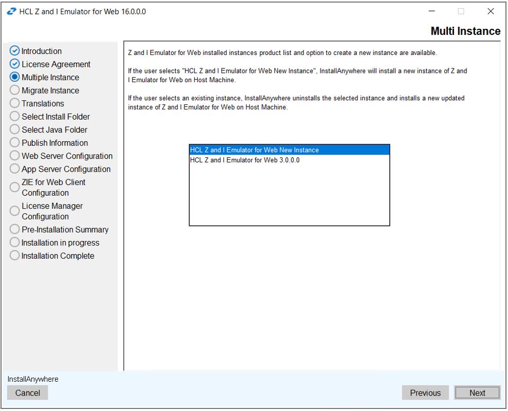 - Z and I Emulator for Web Version 16.0 search the previous installed release of HCL Z and I Emulator for Web v2.2 and displays on Multiple Instance dialog.