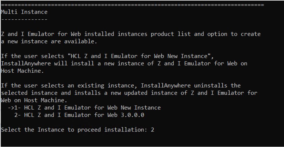 - Z and I Emulator for Web Version 16.0 supports multiple instances, suppose user wants to install latest release as separate product whichever version is already installed needs to select "HCL Z and I Emulator for Web New Instance" in multiple instance dialog and provide different installation path and port to configure as multiple instance installation.