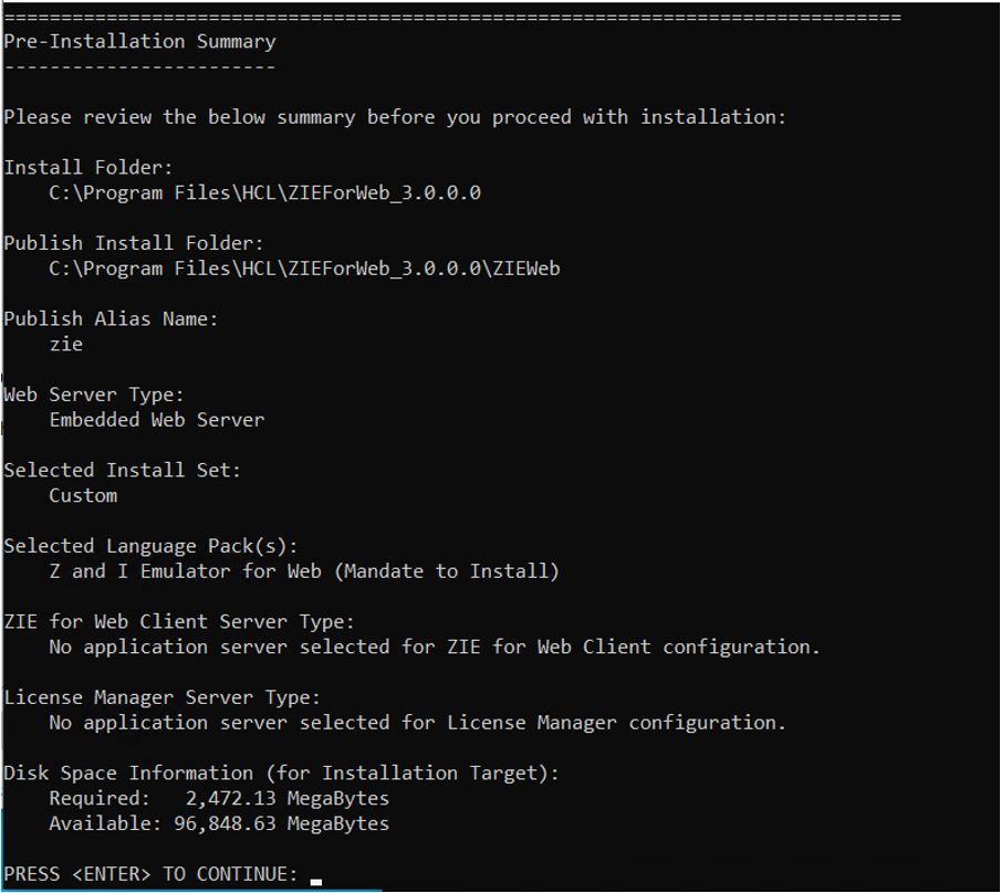 Note: Previous configured Z and I Emulator for Web server location will be retained. - The Pre-Installation Summary screen appears. Review the summary