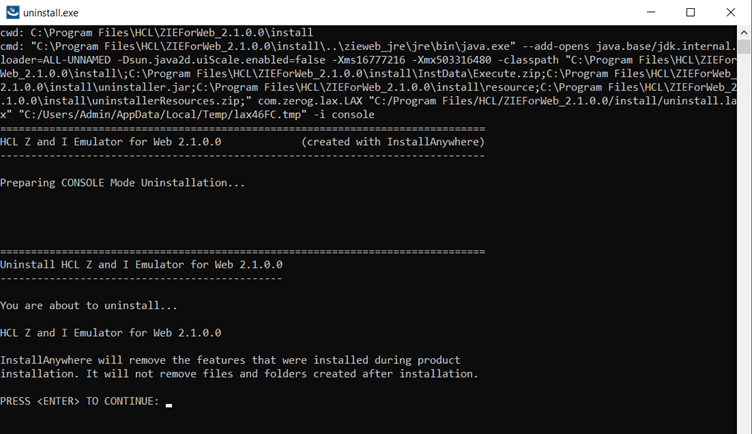 コンソール モードのアンインストール ユーザーは、インストーラーによって表示されるコンソール パネルの入力プロンプトに必要な入力を入力する必要があります。アンインストール ファイルは、ZIEWeb インストール パス (<インストール パス>\install\uninstall) にあります。