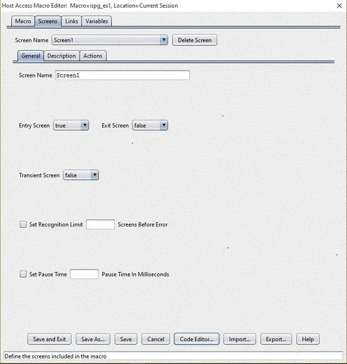 画面タブの一番上にある画面名リスト・ボックスでは、使用したいマクロ画面の名前 (例えば、Screen1) をクリックします。マクロ・エディターは、そのマクロ画面に属する情報をサブタブに表示します。例えば、マクロ・エディターの画面タブ では、リスト・ボックスは、マクロ画面名 Screen1 を表示し、サブタブは、Screen1 に属する情報を表示します。ユーザーがリスト・ボックス内の別のマクロ画面名 (おそらく、Screen10) を選択した場合、マクロ・エディターは、マクロ画面 Screen10 に属する情報をサブタブに表示します。