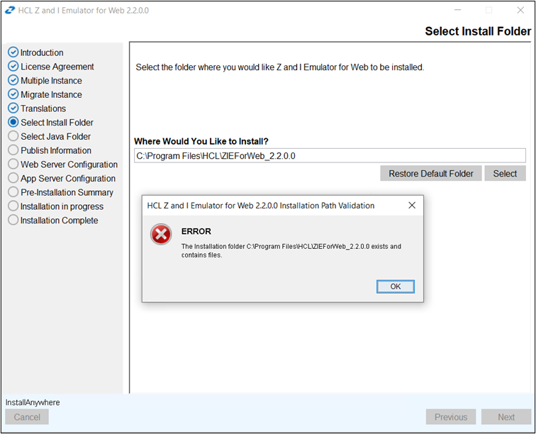 - If the install folder is already existing then the error message get displayed.