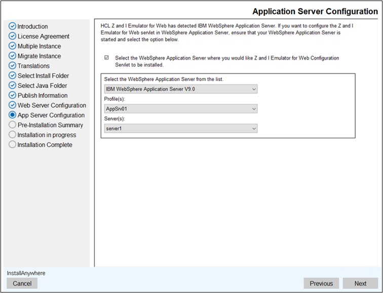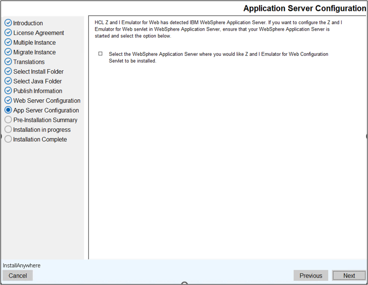 - Select the WebSphere Application Server when you would like Z and I Emulator for Web Configuration Servlet