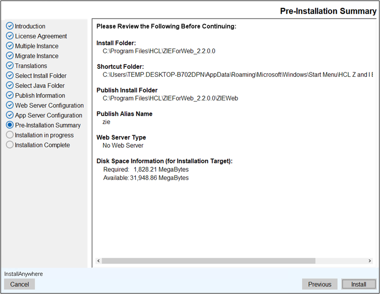 - The Pre- Installation Summary screen displays to review the summary details, for