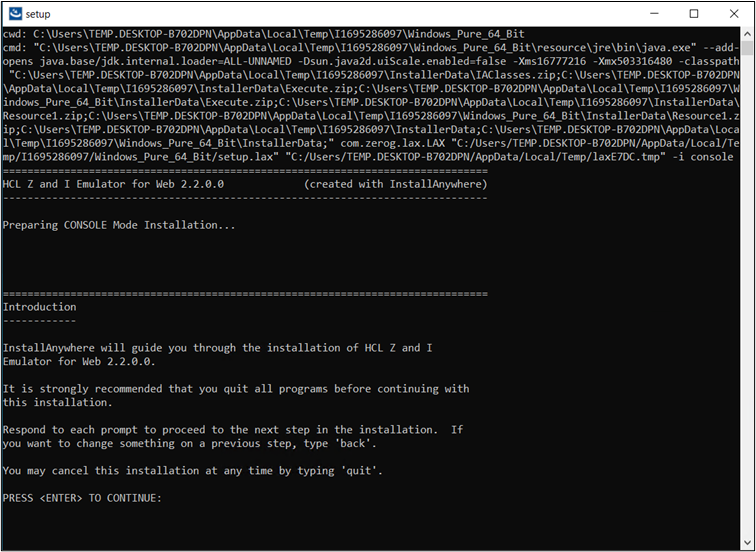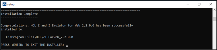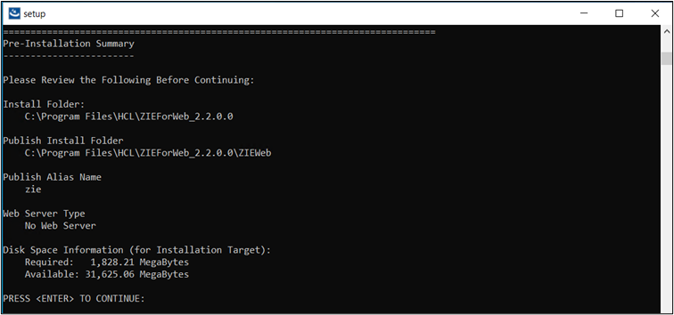 The Pre-installation Summary configuration screen displays to review the product details. Example, product name, installer folder, ZIEWeb server location, etc.
