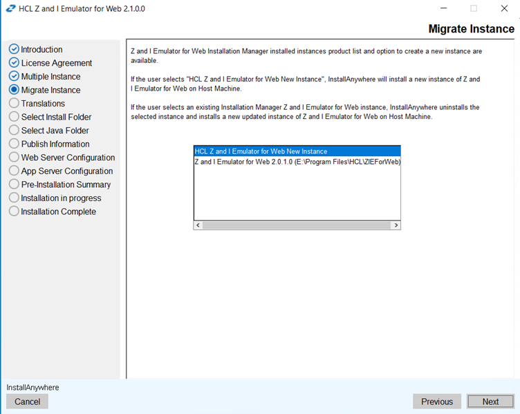 HCL Install Anywhere Z and I Emulator for Web to perform migrate