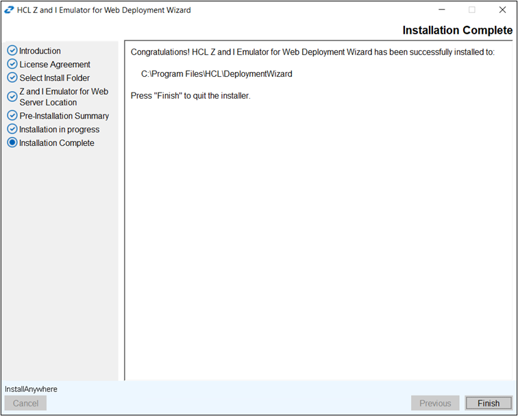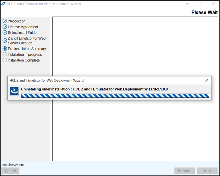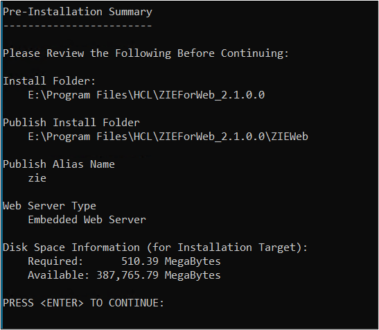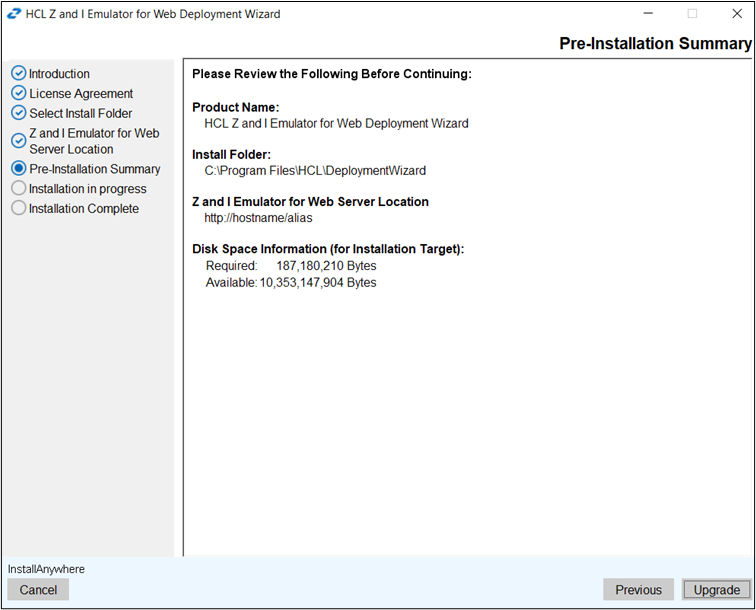 Note: Previous configured Z and I Emulator for Web server location will be retained. - The Pre-Installation Summary screen appears. Review the summary