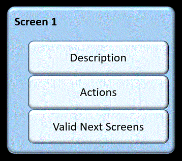 The <nextscreens> element (Valid Next Screens in Conceptual view of a <screen> element) contains a list of the screen names of all the <screen> elements that might validly occur after the current macro screen. The <nextscreens> element and the elements that it encloses are described in Screen Recognition, Part 2.