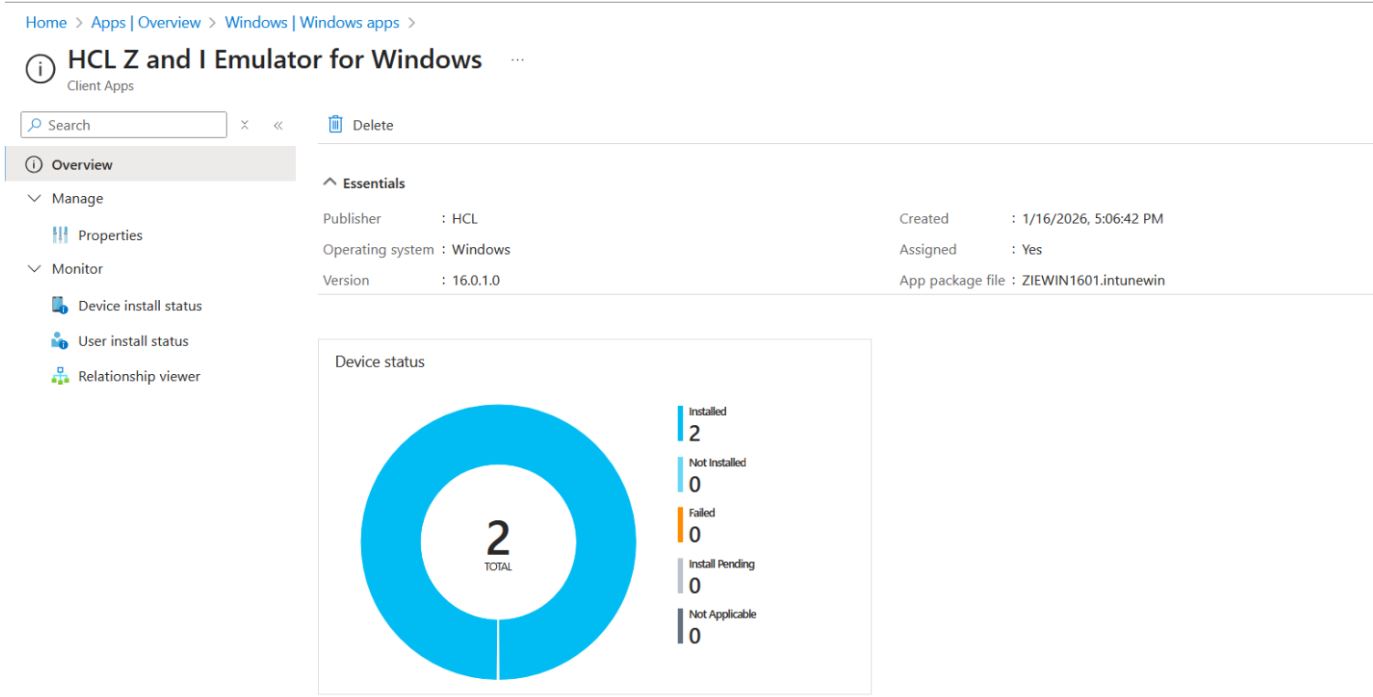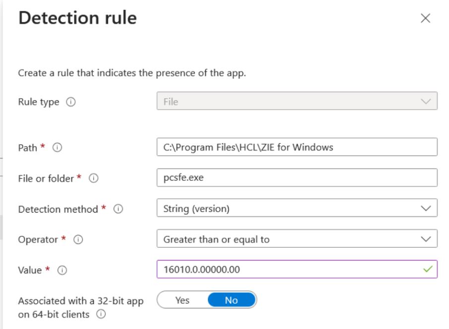 pcsfe.exeorpcsws.exe.Example:C:\Program Files\HCL\ZIE for Windows\pcsfe.exeCondition:Version (>=) 16010.0.00000.000In this example,16010represents the product version, which corresponds to version 16.0.1.0.Note: By default, the Dependencies and Supersedence sections are not required. Configure these sections only if they are needed for the installation of the current release. - In the Assignments section, assign the application to the target devices on which