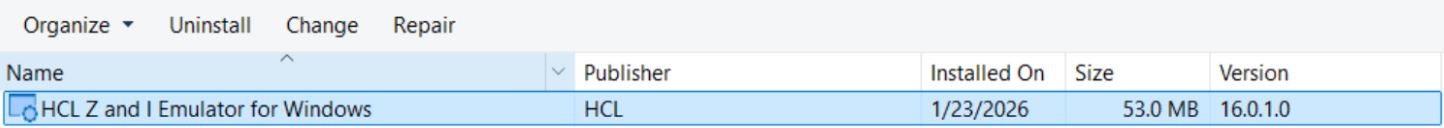 Uninstall: HCL Z and I Emulator for Windows RP1601 mls x64.exe /s /v/qn /x "/L*v \"%temp%\pcsRPUI.log\"