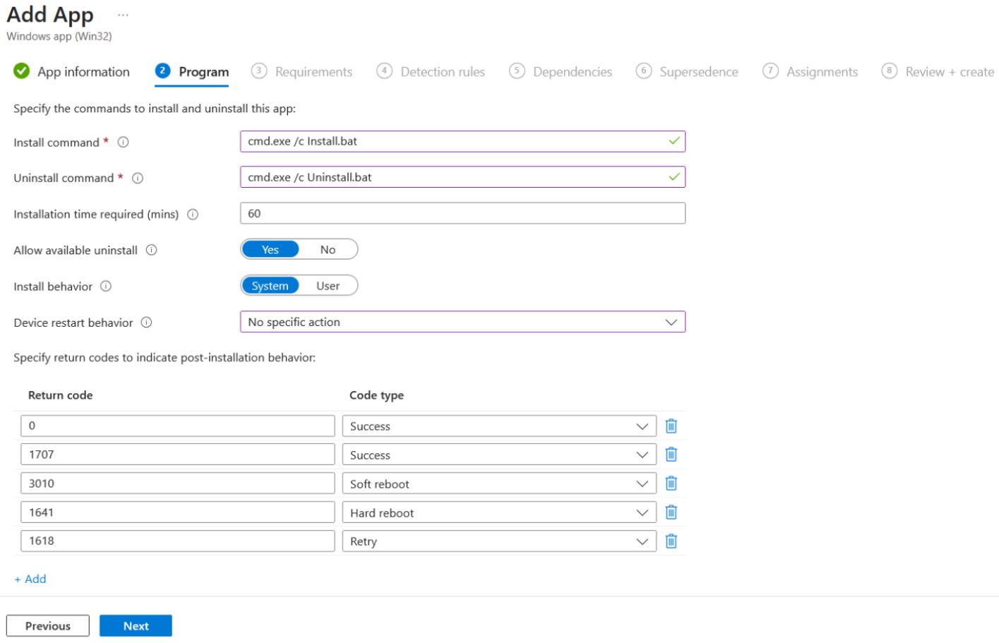 To accommodate the installation and uninstallation using Intune portal, “Install.bat” and “Uninstall.bat” files are used to validate the install and uninstall commands.