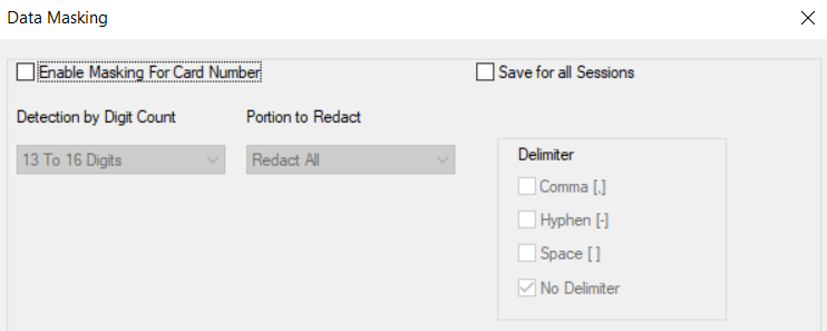 - Select the Enable Masking for Card Number check box.Note: The Enable Masking for Card Number option detects the card digits pattern based on the option selected under the Digit Count and Portion to Redact dropdown menu.