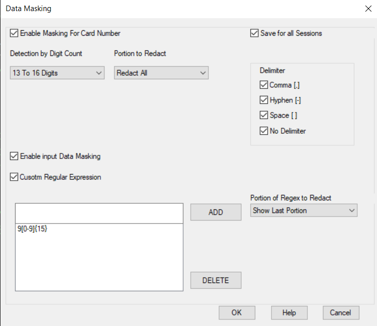 - Select the Custom Regular Expression check box.Note: The data will get masked on the screen based on the regular expression pattern.