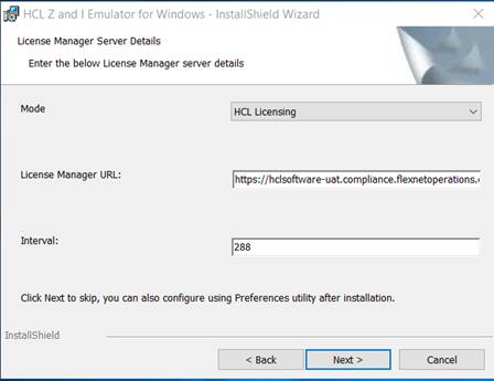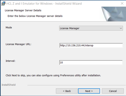 在安装过程中,在“许可证服务器详细信息”安装面板中,用户可以配置“模式”、“许可证 URL”和“续订间隔”字段。用户可以在安装过程中跳过配置,并可以在安装后使用“首选项”实用程序进行配置。