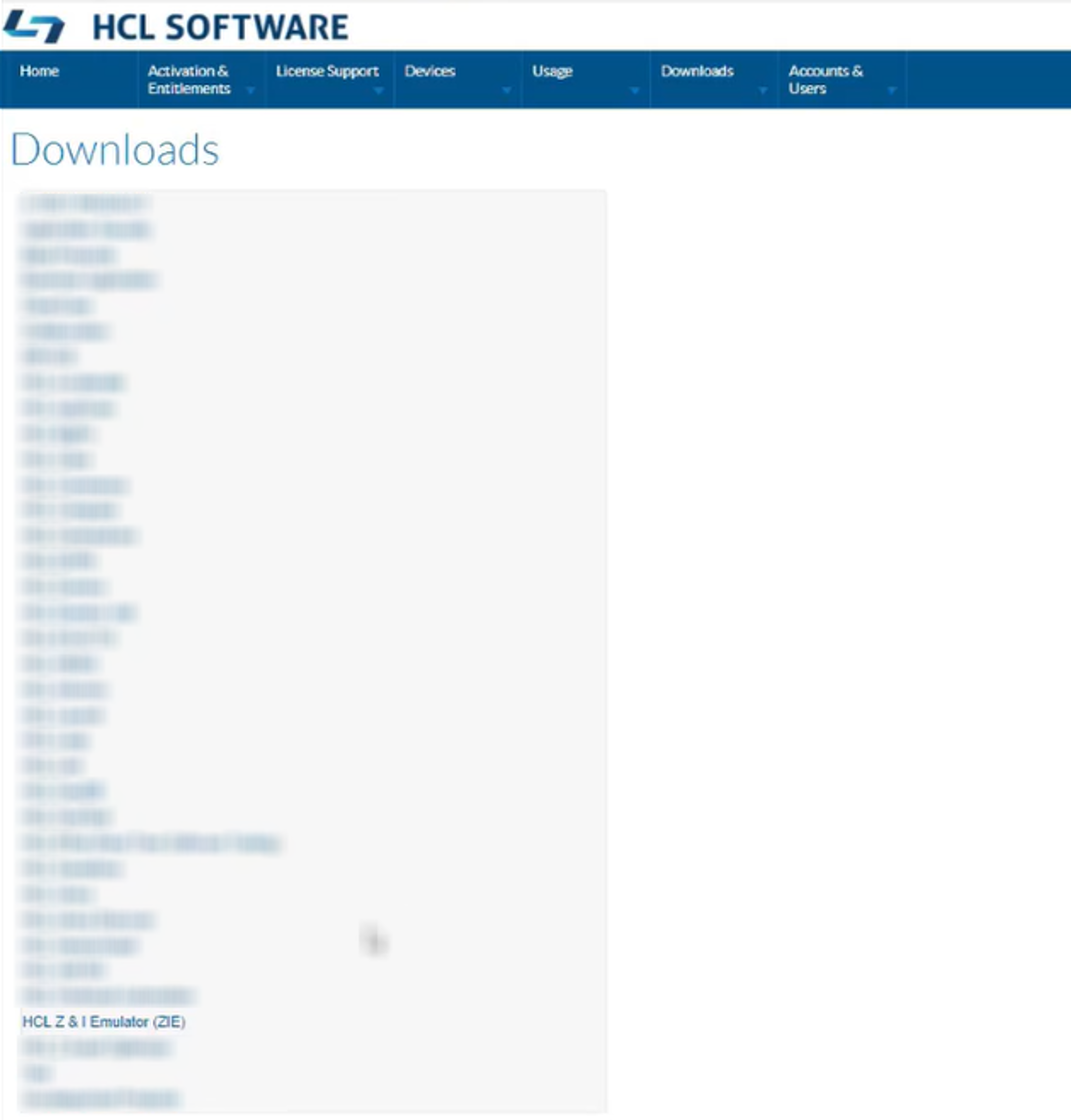 - 选择HCL Z & I 模拟器 (ZIE) 从产品列表中。它会重定向到下载包 页。下图显示在搜索栏中输入的关键字,以查找“HCL ZIE 系列产品”。