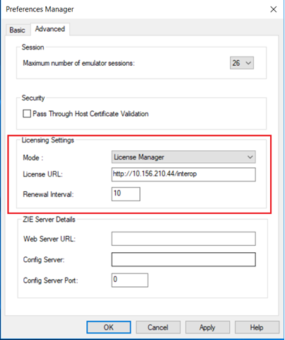 图 11:ZIEWin 中首选项实用程序的高级选项卡内的许可设置和 ZIE 服务器详细信息部分。