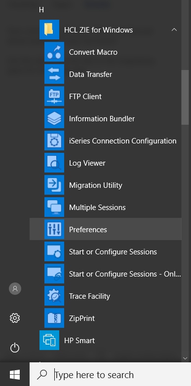 - 可以从产品“HCL ZIE for Windows”下的“Windows 开始菜单”运行“首选项”实用程序,如下所示。