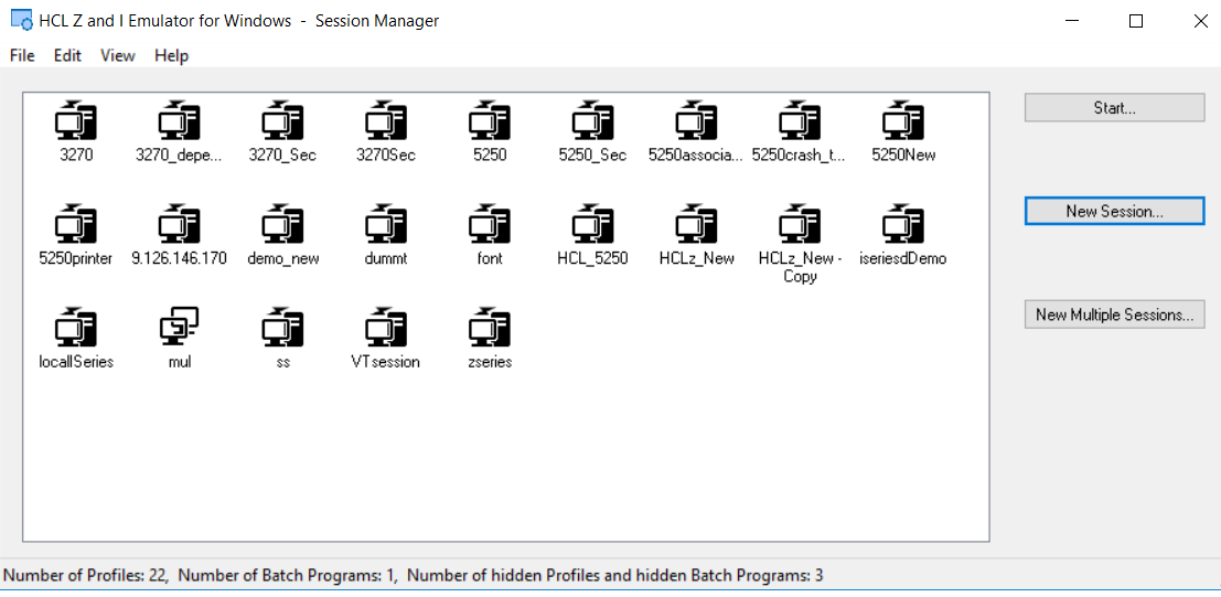 - 通过从产品“HCL ZIE for Windows”下的“Windows 开始菜单”运行“启动或配置会话”来启动会话管理器。用户使用“新会话”按钮“启动”现有会话配置文件或创建模拟器会话。