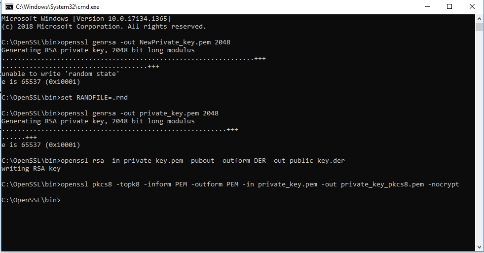 b.生成密钥对(使用 Open SSL 工具)生成的公钥/私钥对用于安全通信。密钥对必须采用“RSA 2048 位”格式。私钥格式必须为“pksc8”,公钥格式必须为“DER”格式。