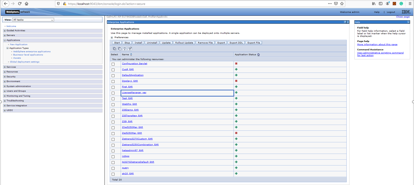 - 部署许可证管理器.ear或.war 应用程序服务器中的文件。下图显示了使用 WebSphere 应用程序服务器部署许可证管理器。