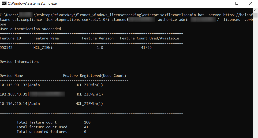 C:\Users\Admin\Desktop\HCL License Server\Others\ [提取的 CLLS 包] \enterprise\flexnetlsadmin.bat -server https:// hclsoftware.compliance.flexnetoperations.com /api/1.0/instances/ FED321CBA -authorize admin xxxx -licenses -verbose