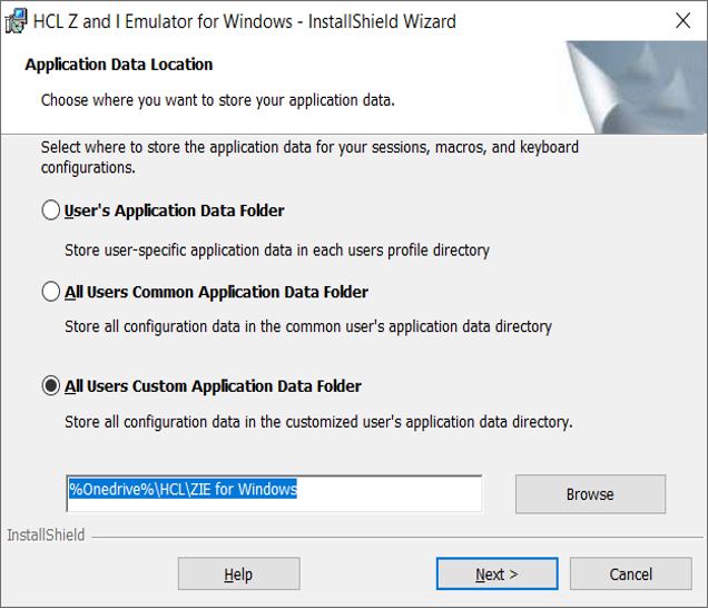 - Sélectionnez l'option « Dossier de données d'application personnalisé » de l'ensemble des utilisateurs et saisissez le chemin d'accès de la variable.
